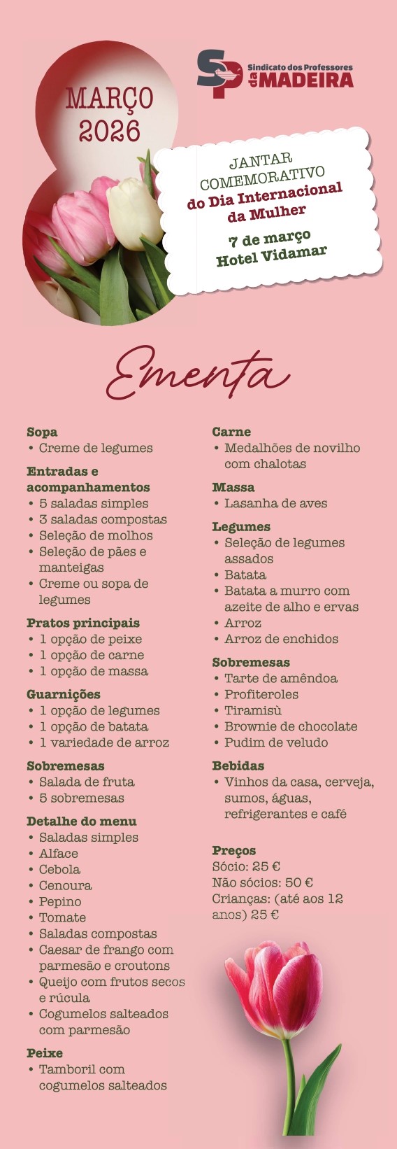 O Sindicato dos Professores da Madeira promove, no próximo dia 7 de março, a comemoração do Dia da Mulher, com um jantar convívio a realizar-se no Hotel Vidamar.