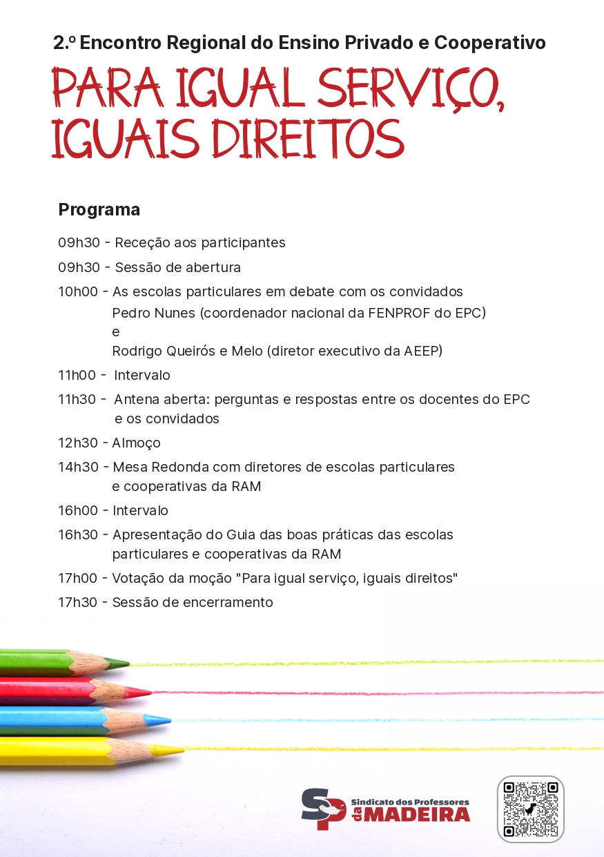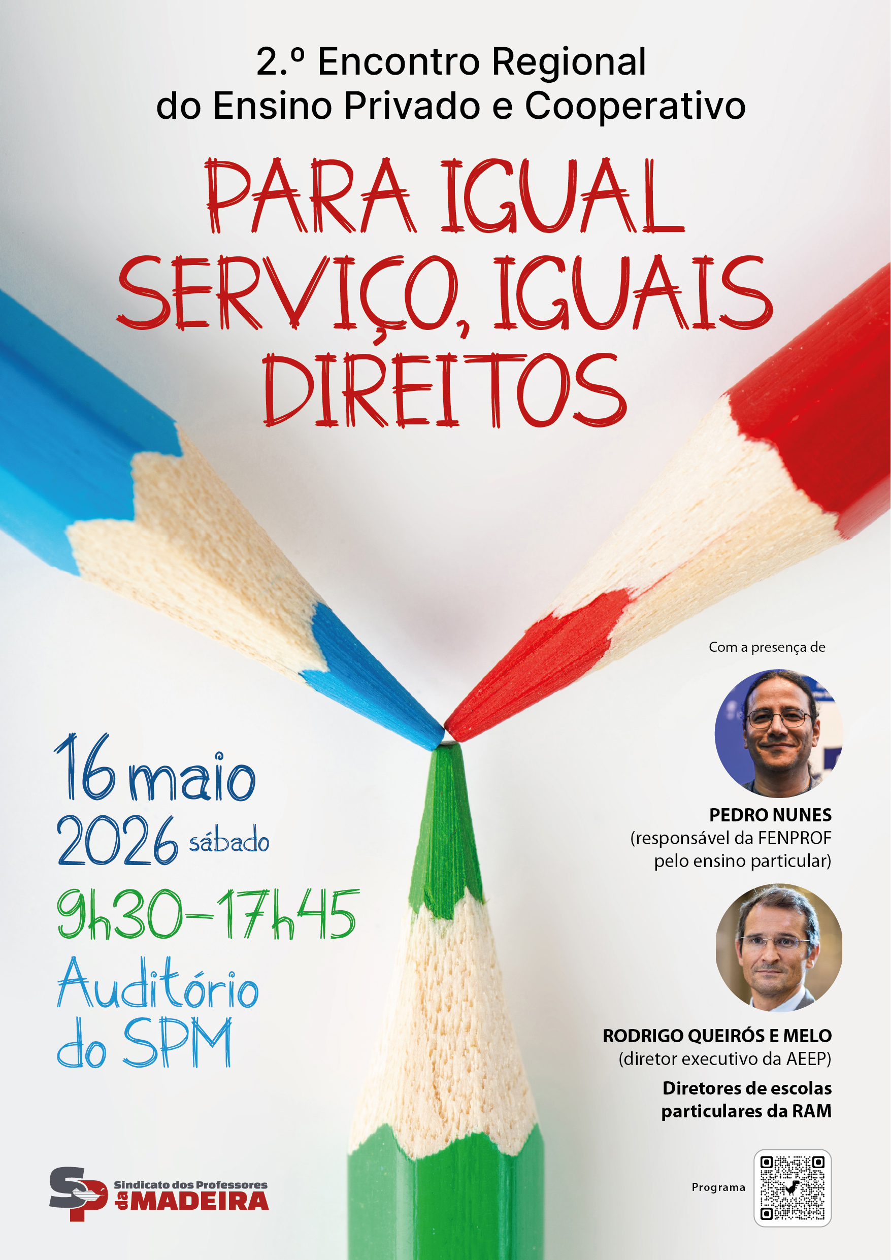 Temos o prazer de te convidar para o 2.º Encontro Regional do Ensino Particular e Cooperativo, que tem por lema “Para igual serviço, iguais direitos” e que contará com um debate entre o representante nacional do setor, o nosso colega Pedro Nunes, e o diretor executivo da Associação de Estabelecimentos do Ensino Particular e Cooperativo (AEEP) e principal negociador da Confederação Nacional de Educação e Formação (CNEF), Rodrigo Queirós e Melo. Por outro lado teremos uma mesa redonda com diretores de algumas escolas particulares da RAM. Este encontro terá lugar no dia 16 de maio próximo (sábado).